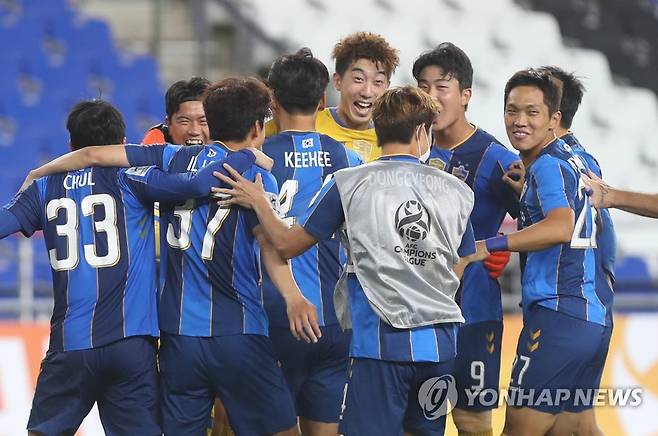 (울산=연합뉴스) 김용태 기자 = 14일 울산 문수축구경기장에서 열린 2021 아시아축구연맹(AFC) 챔피언스리그(ACL) 16강 울산 현대와 가와사키 프론탈레의 경기에서 승부차기로 승리한 울산 선수들이 골키퍼 조현우를 얼싸안고 환호하고 있다. 2021.9.14