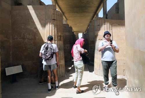epa09467602 Tourists gather outside the entrance to the Tomb of King Djoser, that was reopened for visitors after a restoration, in the Saqqara area, near Giza, Egypt, 14 September 2021. An information plate by the Ministry of Tourism & Antiques at the entrance of the site describes the ancient Southern Tomb step pyramid, also known as the Saqqara pyramid, as being 'the oldest stone building of the ancient world' which was 'discovered by the English archaeologist Cecil Malaby Firth in 1928.' A series of corridors with even some false doors are described as the 'most important architectual and decorative elements' in the tomb that also features a 7.5 x 7.5m burial chamber at a depth of some 31 meters with a sarcophagus made of 16 blocks of pink granite and a height of about 3.6 meters. EPA/KHALED ELFIQI HANDOUT EDITORIAL USE ONLY/NO SALES
