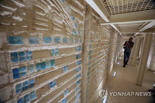 epa09467600 A journalist visits the restored corridors inside the Tomb of King Djoser, that was reopened for visitors after a restoration, in the Saqqara area, near Giza, Egypt, 14 September 2021. An information plate by the Ministry of Tourism & Antiques at the entrance of the site describes the ancient Southern Tomb step pyramid, also known as the Saqqara pyramid, as being 'the oldest stone building of the ancient world' which was 'discovered by the English archaeologist Cecil Malaby Firth in 1928.' A series of corridors with even some false doors are described as the 'most important architectual and decorative elements' in the tomb that also features a 7.5 x 7.5m burial chamber at a depth of some 31 meters with a sarcophagus made of 16 blocks of pink granite and a height of about 3.6 meters. EPA/KHALED ELFIQI HANDOUT EDITORIAL USE ONLY/NO SALES