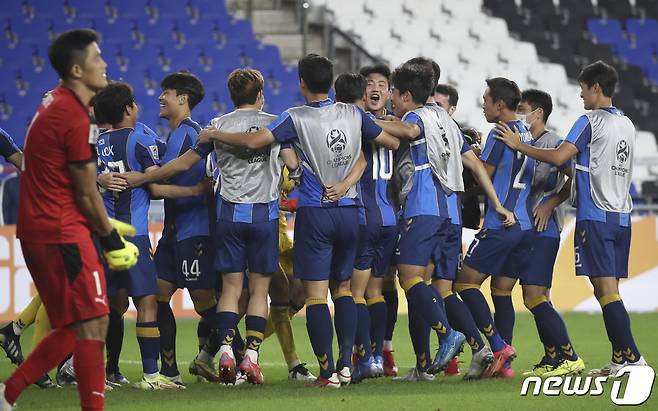 (울산=뉴스1) 윤일지 기자 = 14일 오후 울산 문수축구경기장에서 열린 프로축구 아시아축구연맹 챔피언스리그(ACL) 16강 울산현대와 가와사키 프론탈레의 경기에서 승부차기 접전 끝에 울산이 가와사키에 3대 2로 승리했다. 승리한 울산 선수들이 환호하고 있다. 2021.9.14/뉴스1