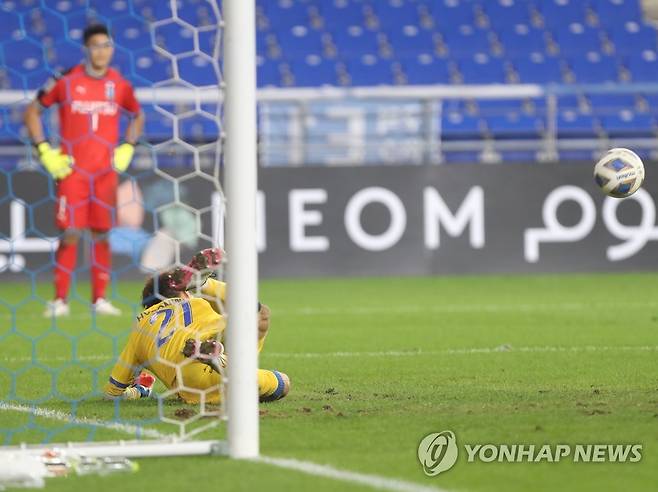 (울산=연합뉴스) 김용태 기자 = 14일 울산 문수축구경기장에서 열린 2021 아시아축구연맹(AFC) 챔피언스리그(ACL) 16강 울산 현대와 가와사키 프론탈레의 경기에서 울산 골키퍼 조현우가 승부차기를 막아내고 있다. 2021.9.14