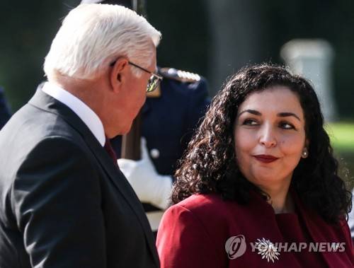 epa09467634 German President Frank-Walter Steinmeier (L) welcomes Vjosa Osmani, President of the Republic of Kosovo with military honors at Bellevue Palace in Berlin, Germany, 14 September 2021. EPA/FILIP SINGER