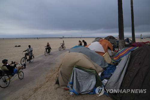 FILE - In this June 29, 2021, file photo people ride their bikes past a homeless encampment set up along the boardwalk in the Venice neighborhood of Los Angeles. The share of Americans living in poverty rose slightly as the COVID pandemic shook the economy last year, but massive relief payments pumped out by Congress eased hardship for many, the Census Bureau reported Tuesday, Sept. 14. The official poverty measure showed an increase of 1 percentage point in 2020, indicating that 11.4% of Americans were living in poverty. It was the first increase in poverty after five consecutive annual declines. (AP Photo/Jae C. Hong, File) June 29, 2021, file photo