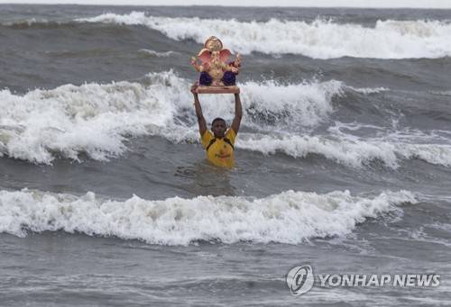 A volunteer immerses an idol of elephant-headed Hindu god Ganesha in the Arabian Sea, during the ten days long Ganesh Chaturthi festival in Mumbai, India, Tuesday, Sept. 14, 2021. (AP Photo/Rafiq Maqbool)