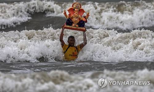 epa09467677 A man carries a statue of the elephant-headed Hindu god Lord Ganesh to be submerged into an artificial pond as part of the Ganesha Chaturthi ritual, in Mumbai, India, 14 September 2021. Ganesha Chaturthi celebrates the birthday of Lord Ganesh and it is one of the biggest Hindu festivals. The ten-day long event is celebrated all over India. EPA/DIVYAKANT SOLANKI
