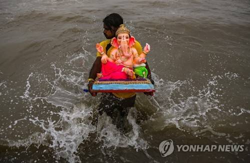 epa09467679 A man carries a statue of the elephant-headed Hindu god Lord Ganesh to be submerged into an artificial pond as part of the Ganesha Chaturthi ritual, in Mumbai, India, 14 September 2021. Ganesha Chaturthi celebrates the birthday of Lord Ganesh and it is one of the biggest Hindu festivals. The ten-day long event is celebrated all over India. EPA/DIVYAKANT SOLANKI