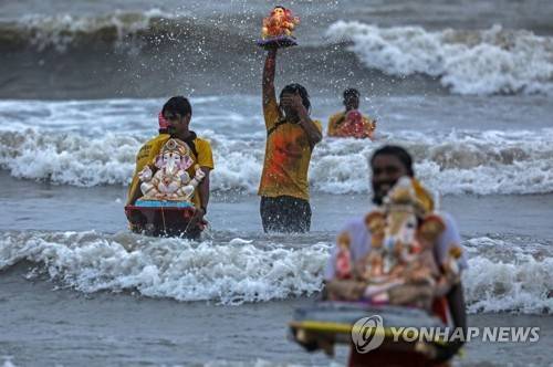 epa09467676 People carry sculptures of the elephant-headed Hindu god Lord Ganesh to be submerged into an artificial pond as part of the Ganesha Chaturthi ritual, in Mumbai, India, 14 September 2021. Ganesha Chaturthi celebrates the birthday of Lord Ganesh and it is one of the biggest Hindu festivals. The ten-day long event is celebrated all over India. EPA/DIVYAKANT SOLANKI