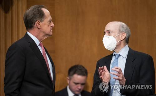 epa09467687 Ranking member Sen. Pat Toomey (L) speaks with Gary Gensler, Chair of the US Securities and Exchange Commission, before the start of the Senate Banking, Housing, and Urban Affairs Committee hearing on 'Oversight of the US Securities and Exchange Commission' in Washington, USA, 14 September 2021. EPA/Bill Clark / POOL
