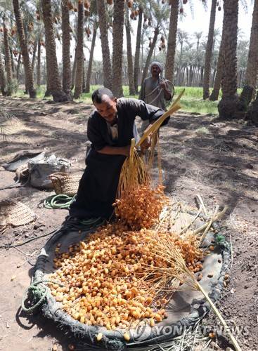 epa09467712 Farm workers collect dates during the annual harvest season at Miit Rahina, south Giza governorate, Egypt, 14 September 2021. Egypt is the world?s top date supplier, producing nearly one in five or 18 percent of the world?s dates, according to the UN Food and Agriculture Organization (FAO). EPA/KHALED ELFIQI
