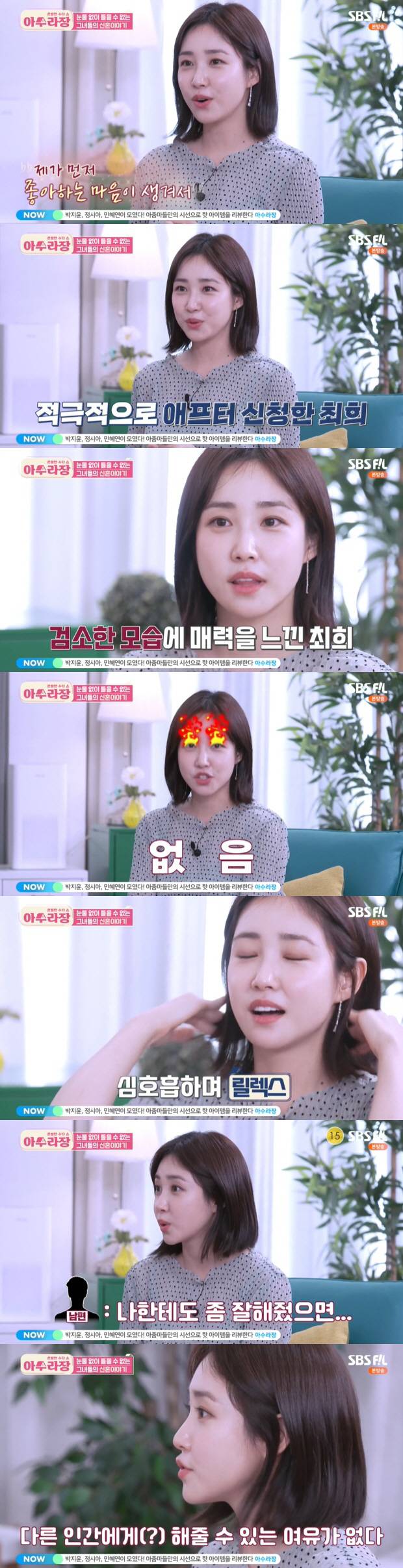 14일 방송된 SBS FiL '아수라장'에는 최희가 게스트로 출연해 남편과의 연애 시절 이야기부터 육아맘으로 보내고 있는 신혼 생활에 대해 털어놨다.