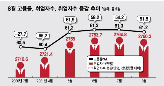 통계청이 15일 발표한 '2021년 8월 고용동향'에 따르면 취업자는 2760만3000명으로 지난해 같은 달과 비교해 51만8000만명 늘었다.