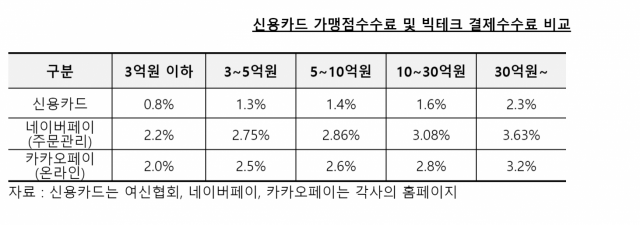 네이버·카카오 페이가 영세상인들로부터 받는 결제 수수료가 신용카드사 대비 거의 세 배에 달하는 것으로 나타났다.