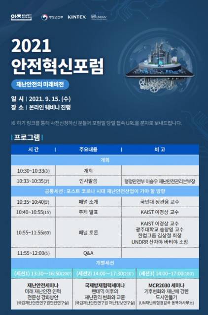 9월 13일부터 17일까지 개최되는 ‘2021 온라인 대한민국 안전산업박람회’와 연계해 개최되는 이번 포럼은 15일 오전 10시 30분부터 오후 5시 30분까지 온라인 생중계로 진행된다.