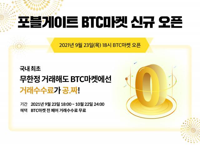 BTC마켓 오픈과 관련해 포블게이트는 KYC 인증과 마케팅 수신 동의를 완료한 회원에 한해 10월 22일까지 한 달간 거래 수수료 무료 혜택을 제공한다. 한편, BTC마켓을 오픈하는 23일 오전 6시부터 오후 6시까지 BTC마켓의 원활한 거래를 위한 점검이 진행돼 모든 거래가 일시 중단될 예정이다.