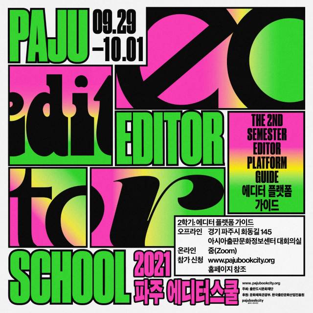 제7회 파주 에디터스쿨(출판도시문화재단 주최, 문화체육관광부·한국출판문화산업진흥원 후원) 2학기 프로그램이 9월 29일부터 10월 1일까지, 3일 동안 개최된다.