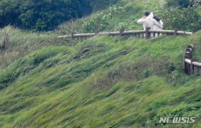 [서귀포=뉴시스] 우장호 기자 = 제14호 태풍 찬투(CHANTHU) 영향으로 제주 전역에 강풍특보가 내려진 15일 오전 제주 서귀포시 대정읍 송악산을 찾은 관광객들이 비바람을 피해 이동하고 있다. 2021.09.15. woo1223@newsis.com