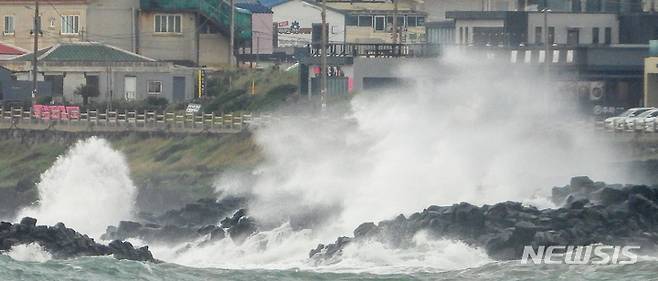 [서귀포=뉴시스] 우장호 기자 = 제14호 태풍 찬투(CHANTHU) 영향으로 제주 전역에 강풍특보가 내려진 15일 오전 제주 서귀포시 대정읍 상모리 해안가에 높은 파도가 몰아치고 있다. 2021.09.15. woo1223@newsis.com