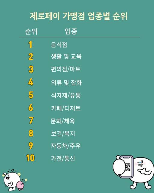 업종별 가맹 현황을 살펴보면 음식점이 29만7000여개로 가장 많았고, 생활 및 교육업이 23만개, 편의점 및 마트가 10만여개로 뒤를 이었다. 제로페이는 편의점부터 동네 마트, 병·의원, 약국, 미용실, 실내 체육센터 등까지 다양한 소상공인 가맹점에서 이용되고 있다.