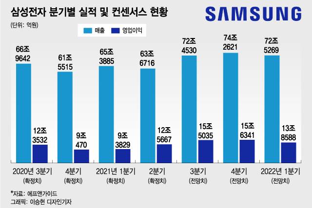 1년 전 시점만 해도 삼성전자의 2021년 3분기 영업이익 컨센서스는 13조2000억원이었으나 현재로부터 3개월 전 시점에 14조4824억원으로 높아졌고 1개월 전 시점에 다시 15조4150억원으로 재상향됐다.