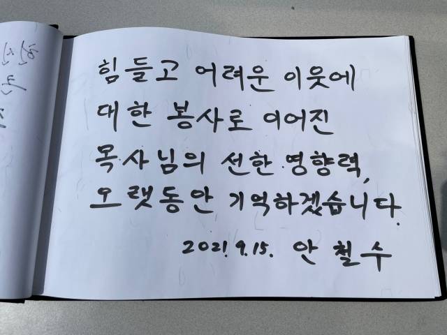 대선후보로 거론되는 안철수 국민의당 대표는 “힘들고 어려운 이웃에 대한 봉사로 이어진 목사님의 선한 영향력, 오랫동안 기억하겠습니다”라고 방명록을 남겼다.