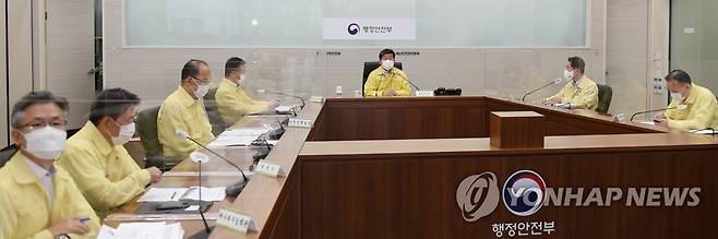 (서울=연합뉴스) 전해철 행정안전부 장관이 15일 정부세종2청사 중앙재난안전대책본부 상황실에서 제14호 태풍 '찬투' 북상에 대비해 20개 중앙부처 및 17개 시도 등 관계기관 담당자들과 긴급 영상회의를 주재하고 있다. 2021.9.15