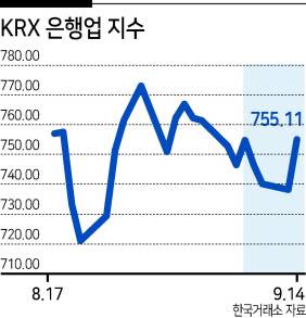 15일 한국거래소에 따르면 KRX 은행업 지수는 8월말 이후 하락세를 이어졌으나 이번주 들어 낙폭을 줄이며 상승 반등한 것으로 나타났다.