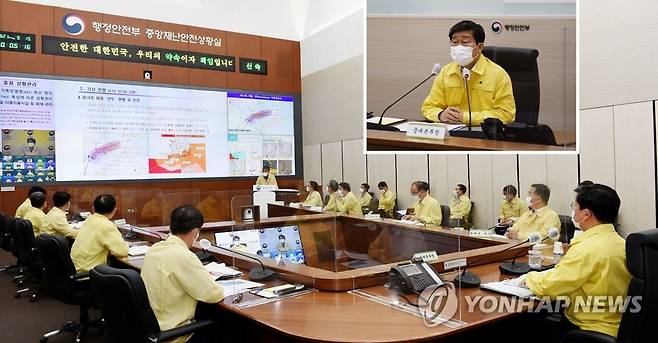 (서울=연합뉴스) 전해철 행정안전부 장관이 15일 정부세종2청사 중앙재난안전대책본부 상황실에서 제14호 태풍 '찬투' 북상에 대비해 20개 중앙부처 및 17개 시도 등 관계기관 담당자들과 긴급 영상회의를 주재하고 있다. 2021.9.15