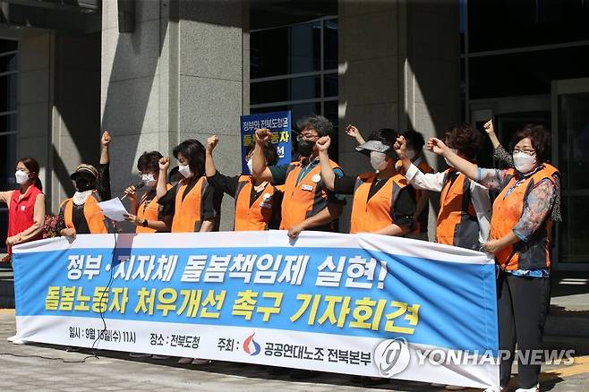 (전주=연합뉴스) 나보배 기자 = 민주노총 민주일반연맹 공공연대노조 전북본부 소속 노인돌봄·아이돌봄 노동자들이 15일 오전 전북도청 앞에서 기자회견을 열고 있다. 노조는 "돌봄 노동자들 대부분은 지자체가 위탁한 민간 기관에 속해서 일한다"며 "정부가 나서서 돌봄 노동자의 처우를 개선해야 한다"고 촉구했다. 2021.9.15