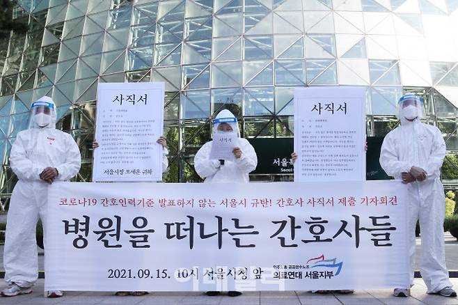[이데일리 이영훈 기자] 민주노총 의료연대본부의 코로나19 간호인력 기준 발표 촉구 기자회견이 15일 서울 중구 서울시 앞에서 열리고 있다.
