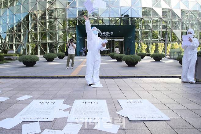회견 참가자들은 지난해 1월부터 올해 7월까지 서울대병원·보라매병원·서울의료원을 떠난 간호사 674명의 사직서를 뿌리는 항의행위를 했다.