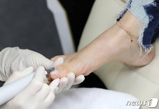 (서울=뉴스1) 박세연 기자 = 15일 서울 강남구 코엑스에서 열린 2021 인터참코리아를 찾은 한 관람객이 페디케어를 받고 있다.