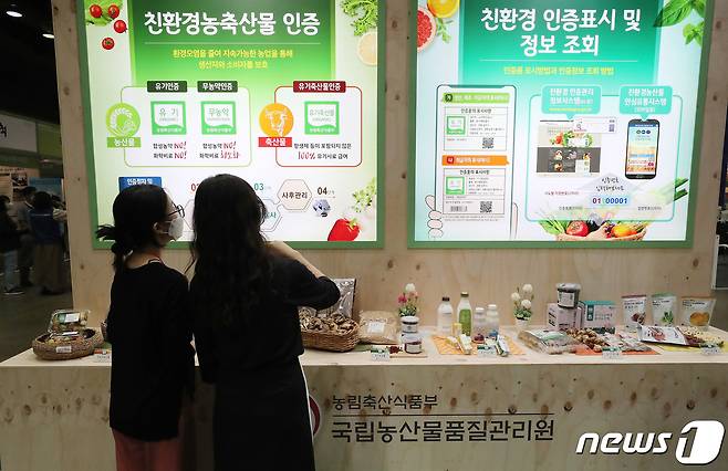 (서울=뉴스1) 박세연 기자 = 15일 서울 강남구 코엑스에서 열린 '내추럴위크 2021'을 찾은 관람객이 농림축산식품부 국립농산물품질관리원부스에서 친환경 유기농 농산물을 살펴보고 있다.