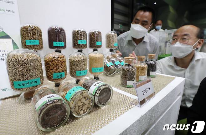 (서울=뉴스1) 박세연 기자 = 15일 서울 강남구 코엑스에서 열린 '내추럴위크 2021'을 찾은 관람객들이 농촌진흥청 국립농업과학원부스에서 다양한 유기종자를 살펴보고 있다.