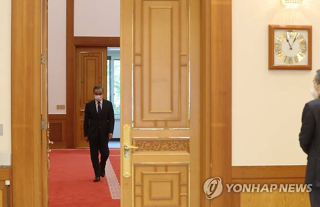 (서울=연합뉴스) 최재구 기자 = 왕이 중국 국무위원 겸 외교부장이 15일 문재인 대통령을 만나기 위해 청와대 접견실로 들어서고 있다. 2021.9.15