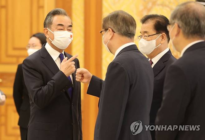 (서울=연합뉴스) 최재구 기자 = 왕이 중국 국무위원 겸 외교부장이 15일 문재인 대통령을 만나기 위해 청와대를 방문해 서훈 국가안보실장과 인사하고 있다. 2021.9.15