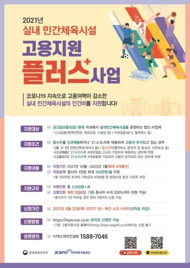 '고용지원 플러스 사업' 신청은 오는 23일부터 선착순으로 이뤄진다. 자세한 내용은 국민체육진흥공단 홈페이지나 콜 센터로 문의하면 된다. 문체부 정책 담당자는 "고용 지원 사업과 함께 코로나19 상황이 안정되면 100만 장 규모의 민간 실내체육시설 대상 소비 할인권 사업(1타 3만 체육 쿠폰) 등을 추진할 계획"이라고 밝혔다.