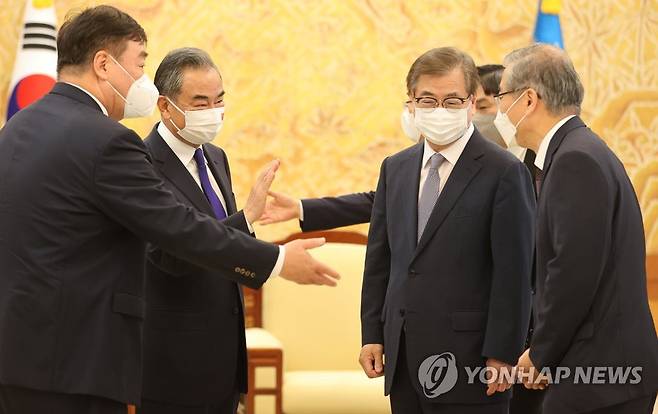(서울=연합뉴스) 최재구 기자 = 왕이 중국 국무위원 겸 외교부장이 15일 문재인 대통령을 만나기 위해 청와대를 방문해 김형진 국가안보실 2차장과 인사하고 있다. 2021.9.15