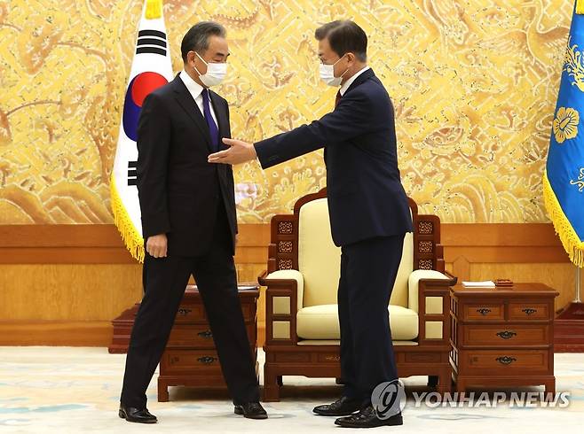 (서울=연합뉴스) 최재구 기자 = 문재인 대통령이 15일 청와대 본관 접견실에서 왕이 중국 국무위원 겸 외교부장을 접견하며 자리를 안내하고 있다. 2021.9.15