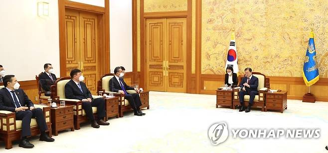 (서울=연합뉴스) 최재구 기자 = 문재인 대통령이 15일 청와대 본관 접견실에서 왕이 중국 국무위원 겸 외교부장을 접견하며 인사말을 하고 있다. 2021.9.15