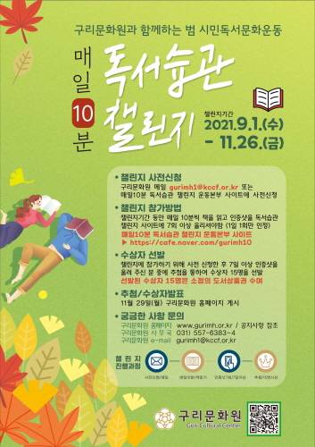 경기 구리시(시장 안승남)는 11월 26일까지 구리문화원(원장 안영기) 주관으로 '매일 10분 독서습관 챌린지'운동을 실시한다.