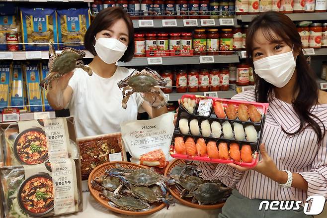 (서울=뉴스1) = 15일 서울 이마트 성수점에서 모델들이 집에서 추석을 보내는 '홈추족'을 위한 가족 먹거리 행사를 소개하고 있다. 이마트는 16일부터 22일까지 일주일간 즉석식품, 가정간편식, 신선식품 등을 최대 40% 저렴하게 판매하는 가족 먹거리 행사를 진행한다. (이마트 제공) 2021.9.15/뉴스1