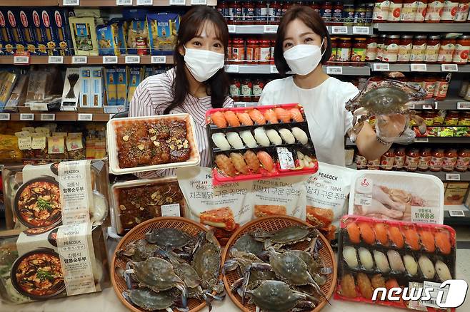 (서울=뉴스1) = 15일 서울 이마트 성수점에서 모델들이 집에서 추석을 보내는 '홈추족'을 위한 가족 먹거리 행사를 소개하고 있다. 이마트는 16일부터 22일까지 일주일간 즉석식품, 가정간편식, 신선식품 등을 최대 40% 저렴하게 판매하는 가족 먹거리 행사를 진행한다. (이마트 제공) 2021.9.15/뉴스1