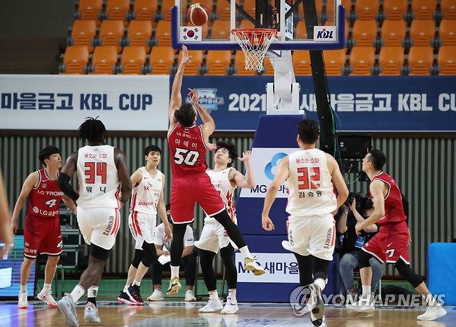 (상주=연합뉴스) 임헌정 기자 = 15일 오후 경북 상주실내체육관에서 열린 2021 MG새마을금고 KBL 컵대회 예선 창원LG 대 서울SK 경기.