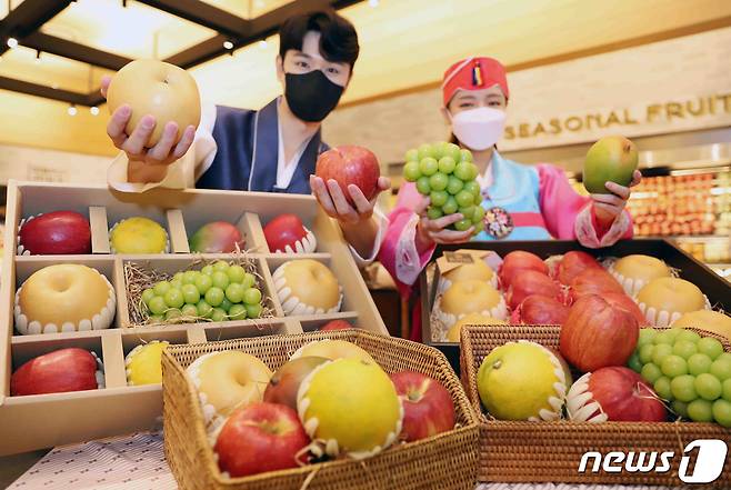 (서울=뉴스1) = 15일 서울 중구 신세계백화점 본점에서 모델들이 추석을 맞아 제철 과일 선물세트를 선보이고 있다. 신세계백화점은 추석을 맞아 경북 상주, 전남 영광, 충남 성환, 충주, 괴산 등 사과, 배, 청망고 그리고 샤인머스켓의 명산지에서 재배된 상품으로 구성된 제철 과일 세트를 선보인다. (신세계백화점 제공) 2021.9.15/뉴스1