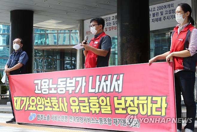 (서울=연합뉴스) 이재희 기자 = 15일 오후 서울 중구 서울고용노동청 앞에서 열린 '재가방문요양보호사의 법정공휴일 유급휴무 보장 촉구 및 임금체불진정 기자회견'에서 전현욱 전국요양서비스노조 서울지부장이 발언하고 있다. 2021.9.15
