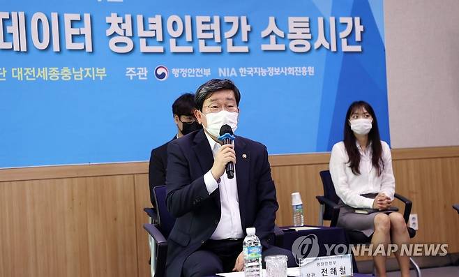 (서울=연합뉴스) 전해철 행정안전부 장관이 청년주간을 맞이해 15일 오후 도로교통공단 대전세종충남지부를 방문, 공공빅데이터 청년인턴 사업 현장을 둘러본 뒤 청년인턴들과 간담회를 하고 있다. 2021.9.15