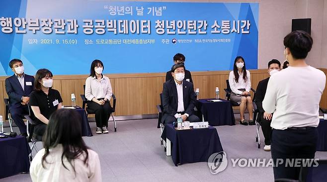 (서울=연합뉴스) 전해철 행정안전부 장관이 청년주간을 맞이해 15일 오후 도로교통공단 대전세종충남지부를 방문, 공공빅데이터 청년인턴 사업 현장을 둘러본 뒤 청년인턴들과 간담회를 하고 있다. 2021.9.15
