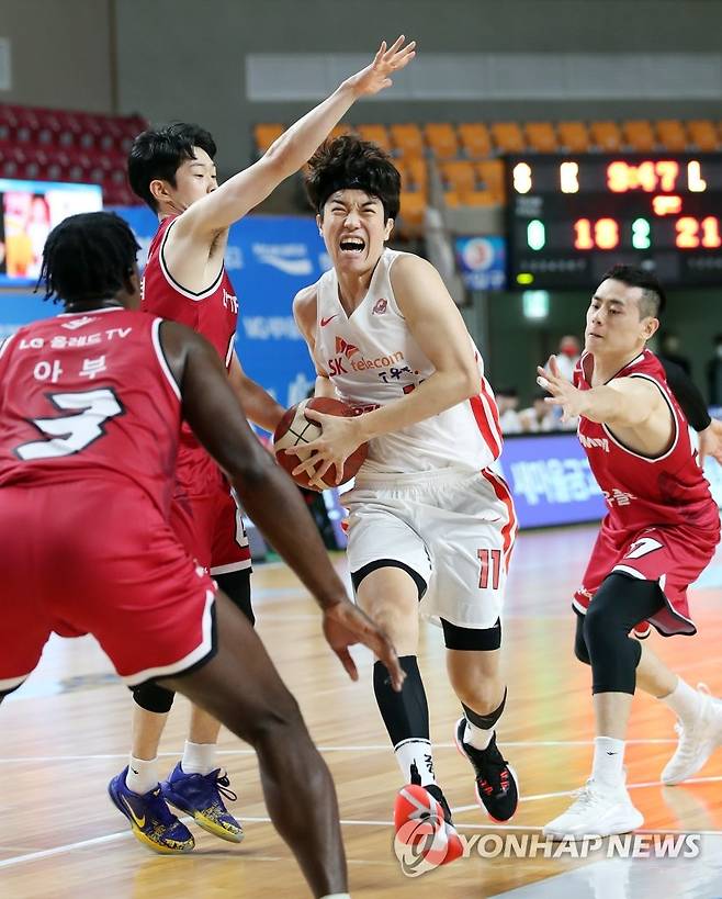 (상주=연합뉴스) 임헌정 기자 = 15일 오후 경북 상주실내체육관에서 열린 2021 MG새마을금고 KBL 컵대회 예선 창원LG 대 서울SK 경기.