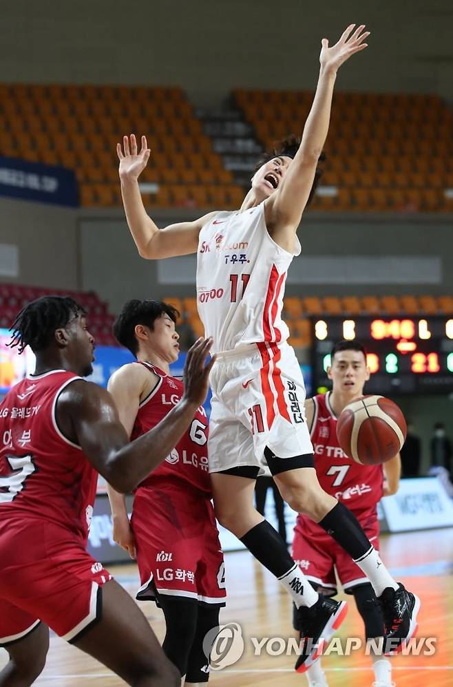 (상주=연합뉴스) 임헌정 기자 = 15일 오후 경북 상주실내체육관에서 열린 2021 MG새마을금고 KBL 컵대회 예선 창원LG 대 서울SK 경기.