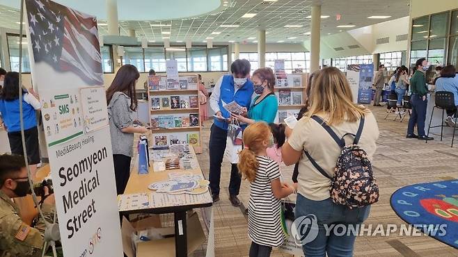 (부산=연합뉴스) 15일 경기 평택 미군기지 내 듀크 도서관에서 열린 '의료-웰니스' 홍보 행사에 참가한 부산 부산진구청과 관내 의료기관 관계자들이 서면메디컬스트리트 등을 홍보하고 있다. 2021.9.15 [부산 부산진구청 제공·재판매 및 DB 금지]